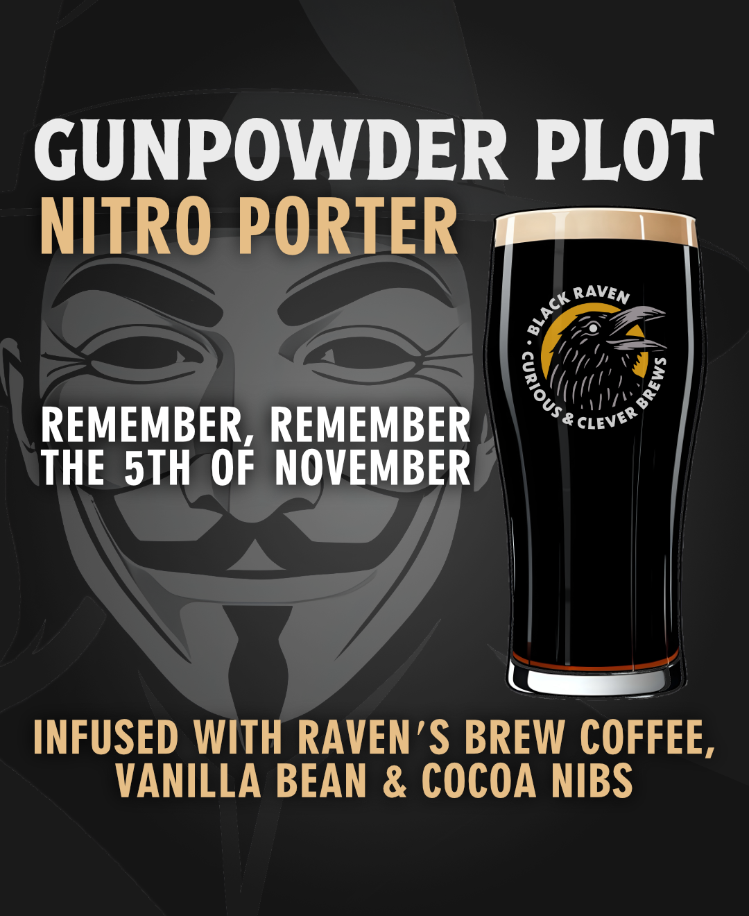 Our annual nod to the infamous Guy Fawkes night, this rich nitro porter is infused with whiskey-soaked cocoa nibs, and a hand-picked blend of Raven’s Brew coffee varietals. Smooth, creamy, and layered with roasted malt and dark chocolate—perfect for cooler nights and quiet rebellions alike.