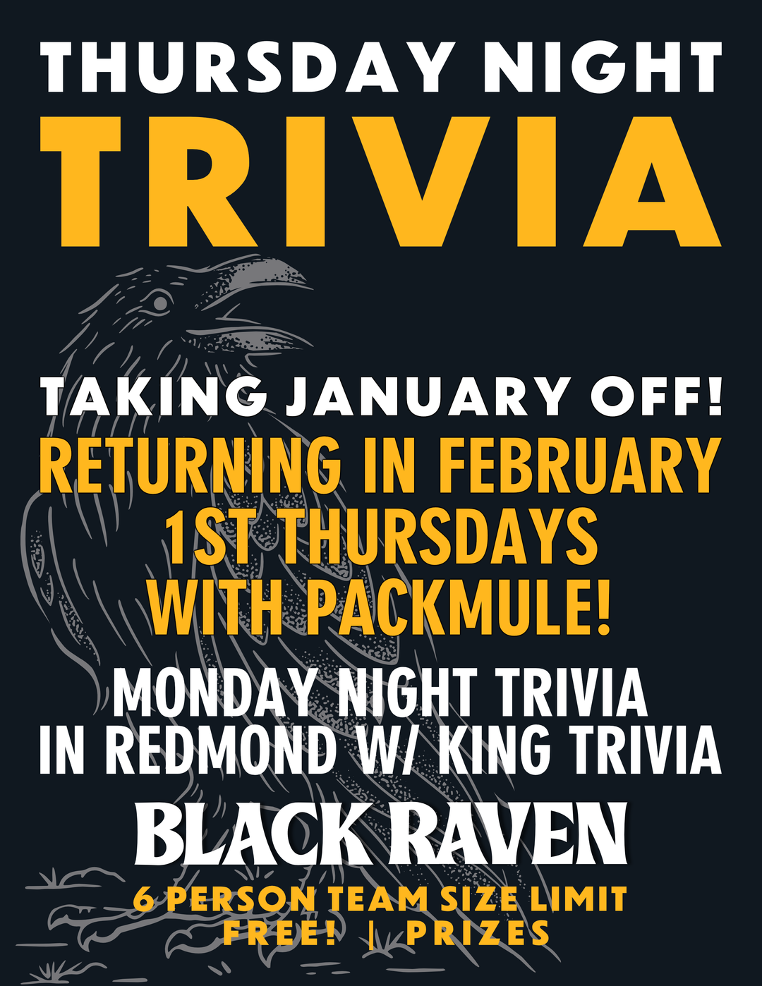 We are taking the month off in Woodinville. Please join us on Monday nights at our Redmond location with King Trivia.