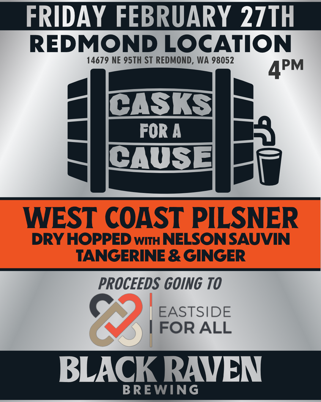 Cask for a Cause taps Friday February 27th in Redmond! We’ve teamed up with Eastside For All to support their work in energizing Eastside Communities to Transform Local Policies, Practices, Relationships, and Investments making the East King County a welcoming community.